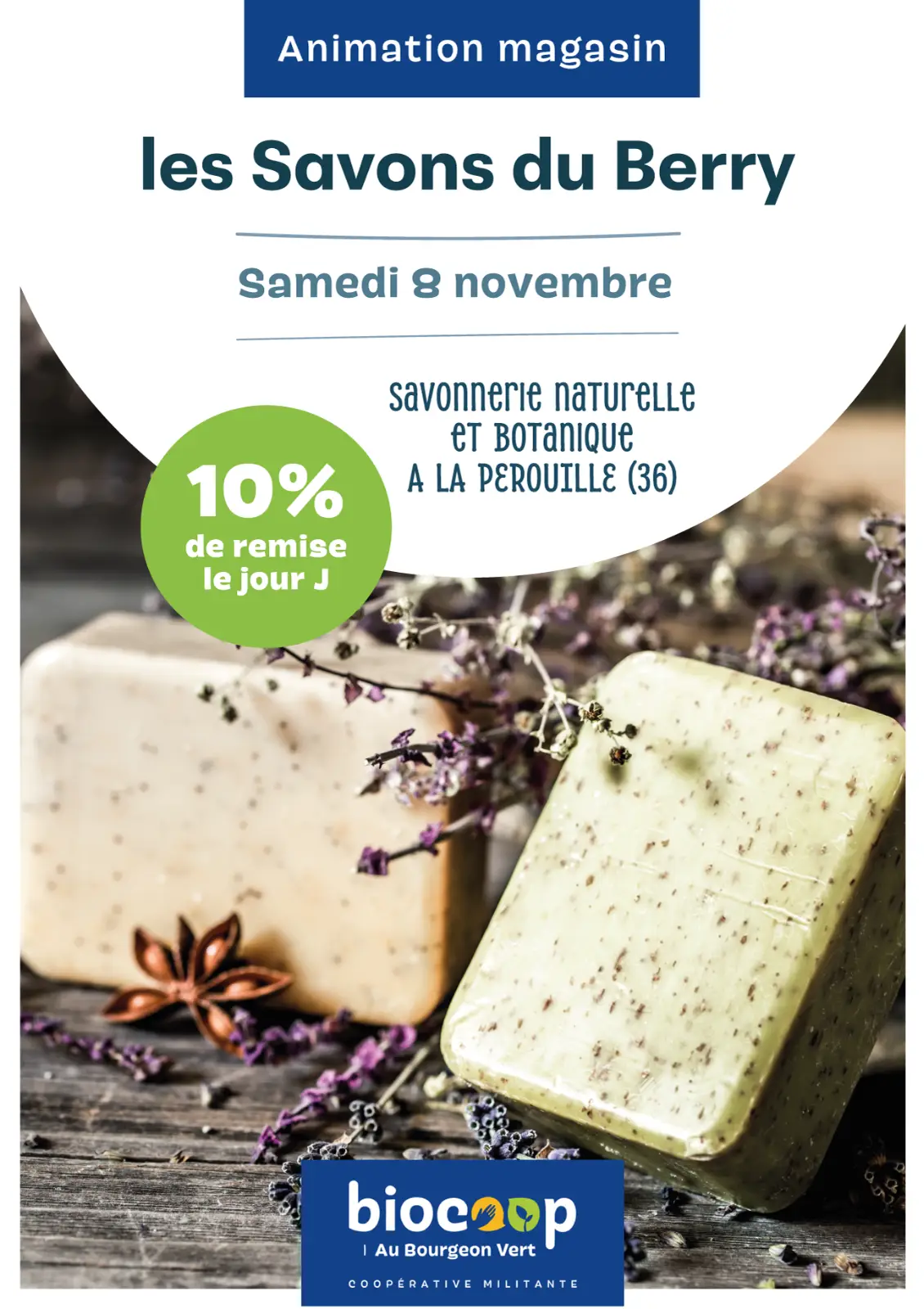 Le samedi 8 novembre, venez rencontrer Les Savons du Berry dans votre magasin Biocoop Au Bourgeon Vert !